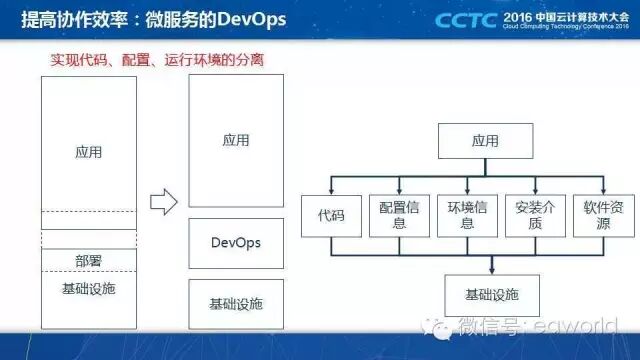 我们用 DevOps 提高协作的效率,加快开发、测试、部署的效率,首先是将应用代码与基础设施分离,开发工程师提供应用的代码、配置、环境信息、安装介质、实现后的软件资源(例如对外接口、数据库表),通过 DevOps 平台进行自动化的部署。