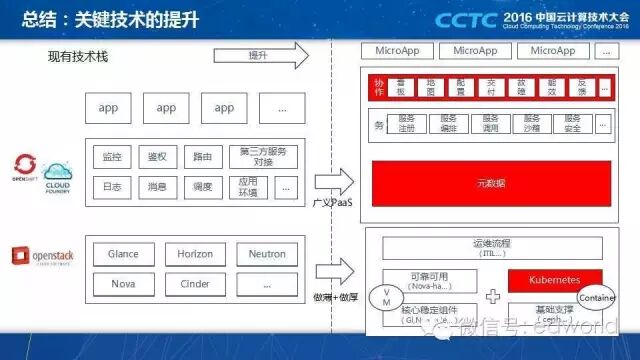 总结一下今天的内容:我们在这些年的实践中,用微服务架构支撑企业的数字化,采用的技术从 OpenStack + CloudFoundry 等管理为主,逐步过渡到 Kubernetes + OpenStack 的模式,同时利用元数据技术提高微服务架构的治理效率,用 DevOps 提高协作的效率。