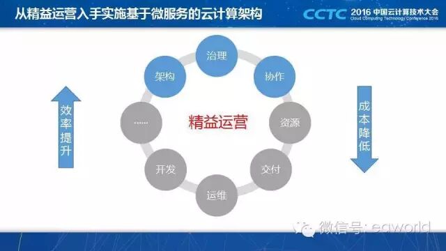 从这个角度看,实施云计算就是做精益运营,而微服务架构为精益运营提供了架构上的保证,因为微服务是小的、容易变化的、容易控制的。