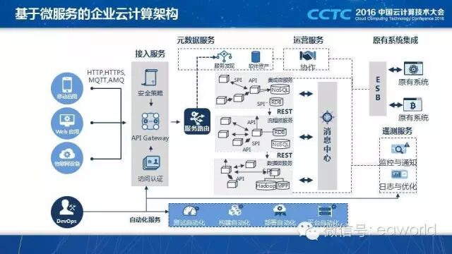 上图是一个微服务架构的全景图,注意右上角用 ESB 与传统系统连接。说个题外话,最近很多次交流,大家都提到嵌入式的集成与 ESB 集成模式的关系,应该如何选择,我认为两种都需要,前者对同质系统、自研系统比较合适,而后者用于异构的集成,例如我外购了一个产品,无法把集成的逻辑嵌入到该产品中,只能通过 ESB 进行连通。