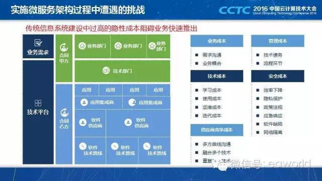 微服务是实现对外服务所必要的,原因有三:1、核心来自对外服务往往与互联网企业竞争,需要更快的速度;2、这些服务往往不是企业当前擅长的,要快速试错;3、业务的压力服务预计,需要架构的弹性。例如我们一个农村商业银行的客户,做了一个农产品买卖的电子商务平台,电子商务业务是他们不擅长的,而直接竞争对手就包括目前的互联网企业,迫使我们必须学习互联网企业的经验。