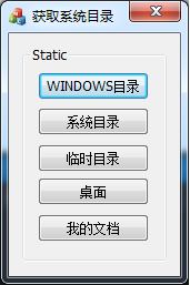 1 void C获取系统目录Dlg::OnBnClickedButton1() 2 { 3 TCHAR szPath[MAX_PATH] = { 0 }; 4 GetWindowsDirectory(szPath, MAX_PATH); 5 MessageBox(szPath); 6 } 7 8 9 void C获取系统目录Dlg::OnBnClickedButton2() 10 { 11 TCHAR szPath[MAX_PATH] = { 0 }; 12 GetSystemDirectory(szPath, MAX_PATH); 13 MessageBox(szPath); 14 } 15 16 17 void C获取系统目录Dlg::OnBnClickedButton3() 18 { 19 TCHAR szPath[MAX_PATH] = { 0 }; 20 GetTempPath(MAX_PATH, szPath); 21 MessageBox(szPath); 22 } 23 24 25 void C获取系统目录Dlg::OnBnClickedButton4() 26 { 27 TCHAR szPath[MAX_PATH] = { 0 }; 28 SHGetSpecialFolderPath(m_hWnd, szPath, CSIDL_DESKTOP, FALSE); 29 MessageBox(szPath); 30 } 31 32 33 void C获取系统目录Dlg::OnBnClickedButton5() 34 { 35 TCHAR szPath[MAX_PATH] = { 0 }; 36 SHGetSpecialFolderPath(m_hWnd, szPath, CSIDL_MYDOCUMENTS, FALSE); 37 MessageBox(szPath); 38 }