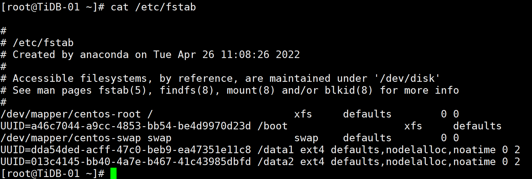 UUID=dda54ded-acff-47c0-beb9-ea47351e11c8 /data1 ext4 defaults,nodelalloc,noatime 0 2