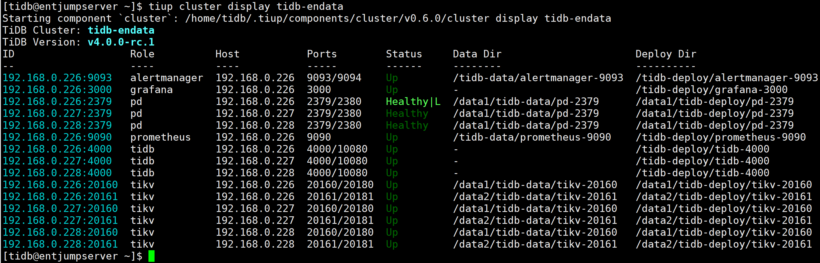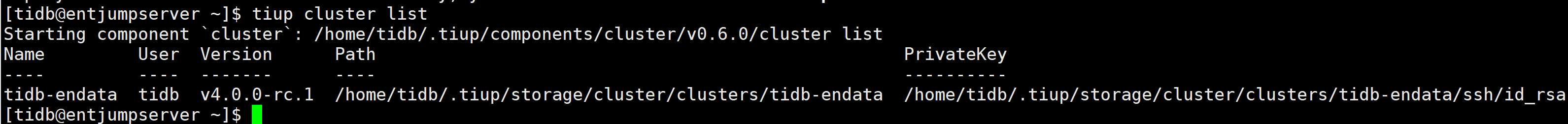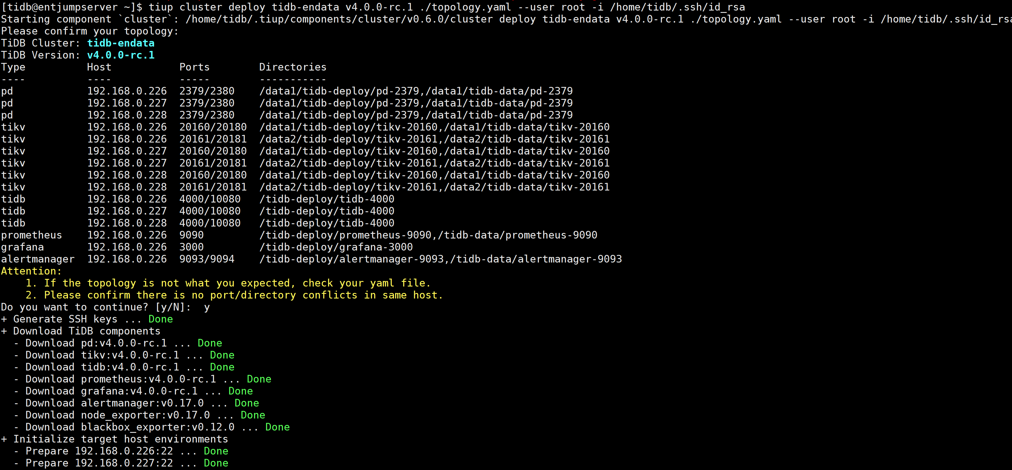 tiup cluster deploy tidb-endata v4.0.0-rc.1 ./topology.yaml --user root -i /home/tidb/.ssh/id_rsa