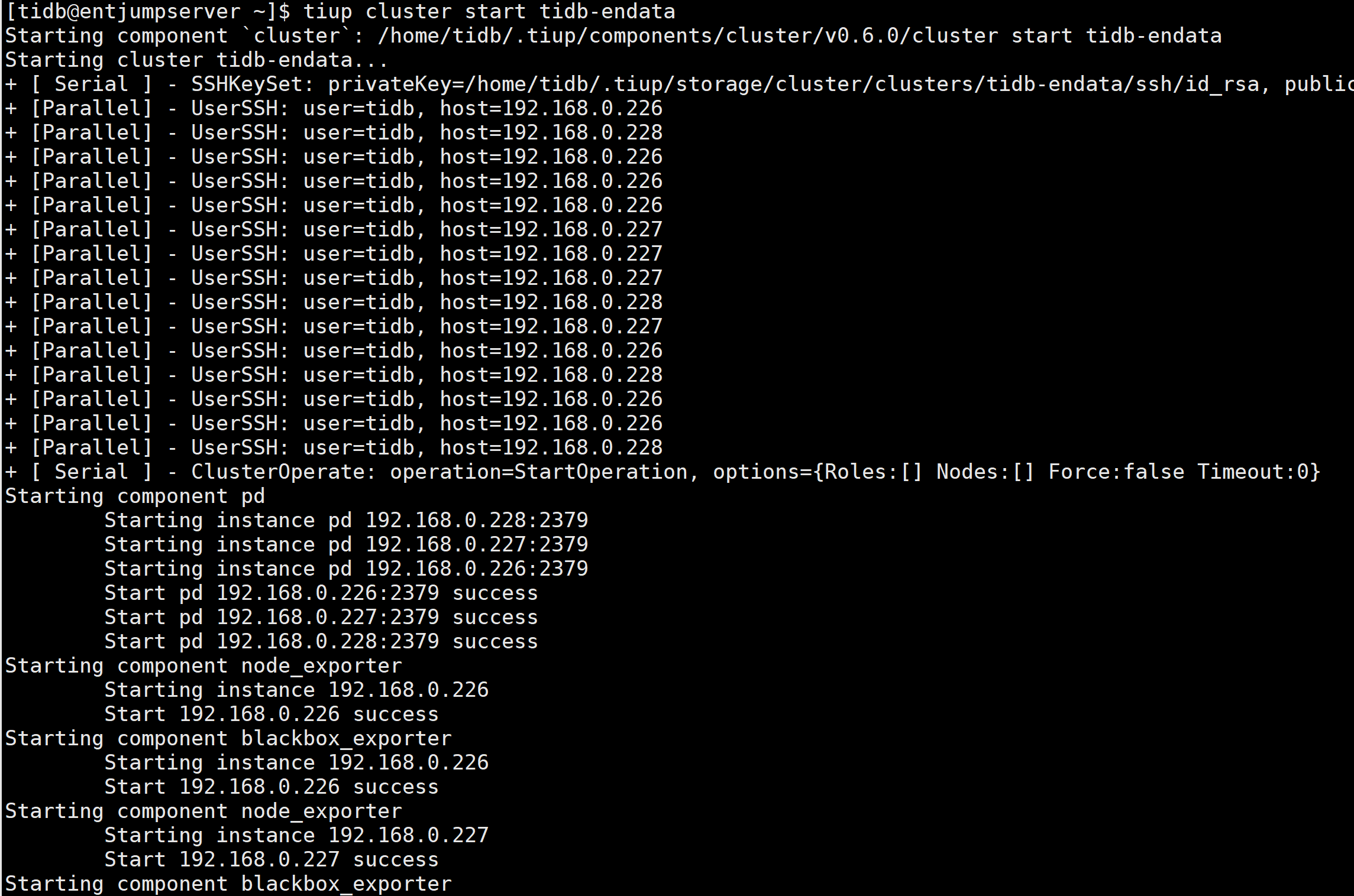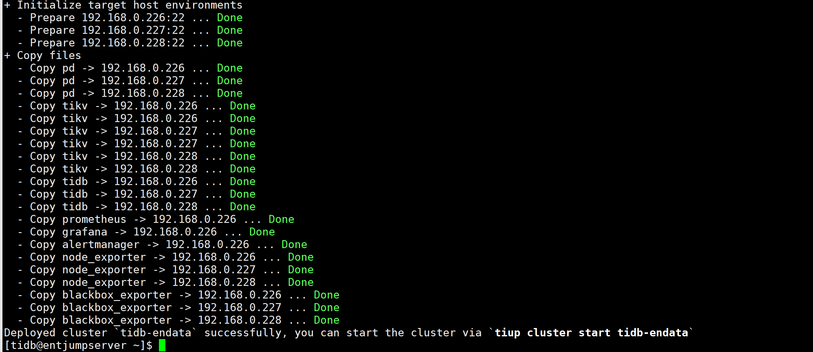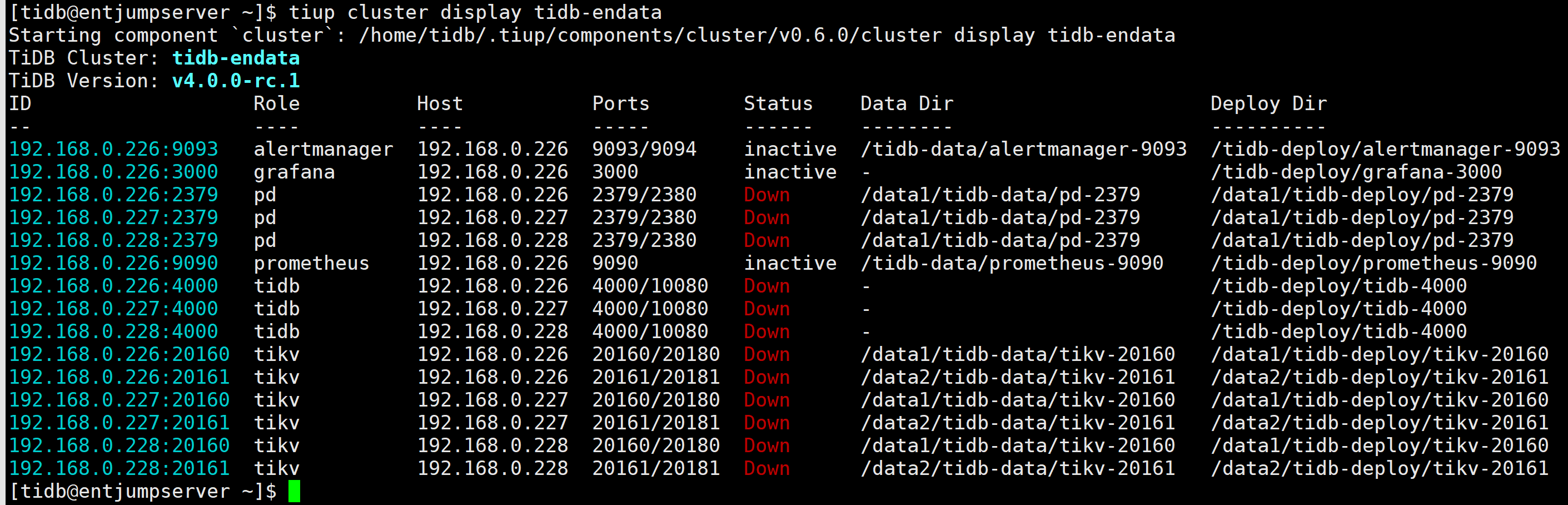 tiup cluster deploy tidb-endata v4.0.0-rc.1 ./topology.yaml --user root -i /home/tidb/.ssh/id_rsa