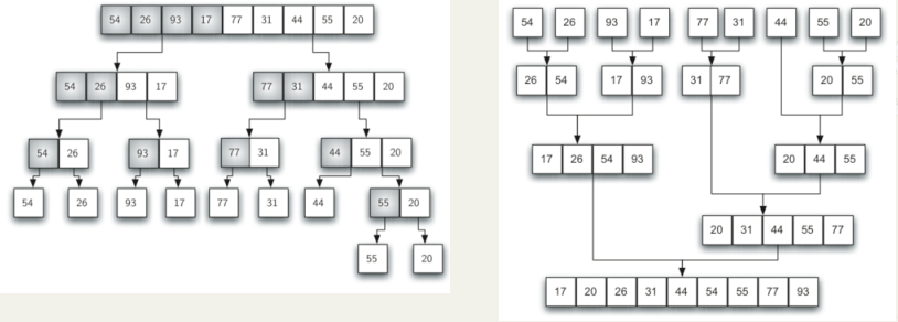 左图是将数组分开,右图是将数组合并起来。下面我们来进一步看一下具体的实现过程: