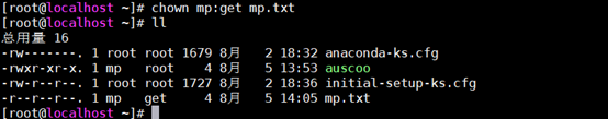 chown mp:get mp.txt :变更当前的目录或文件的所属用户和组
