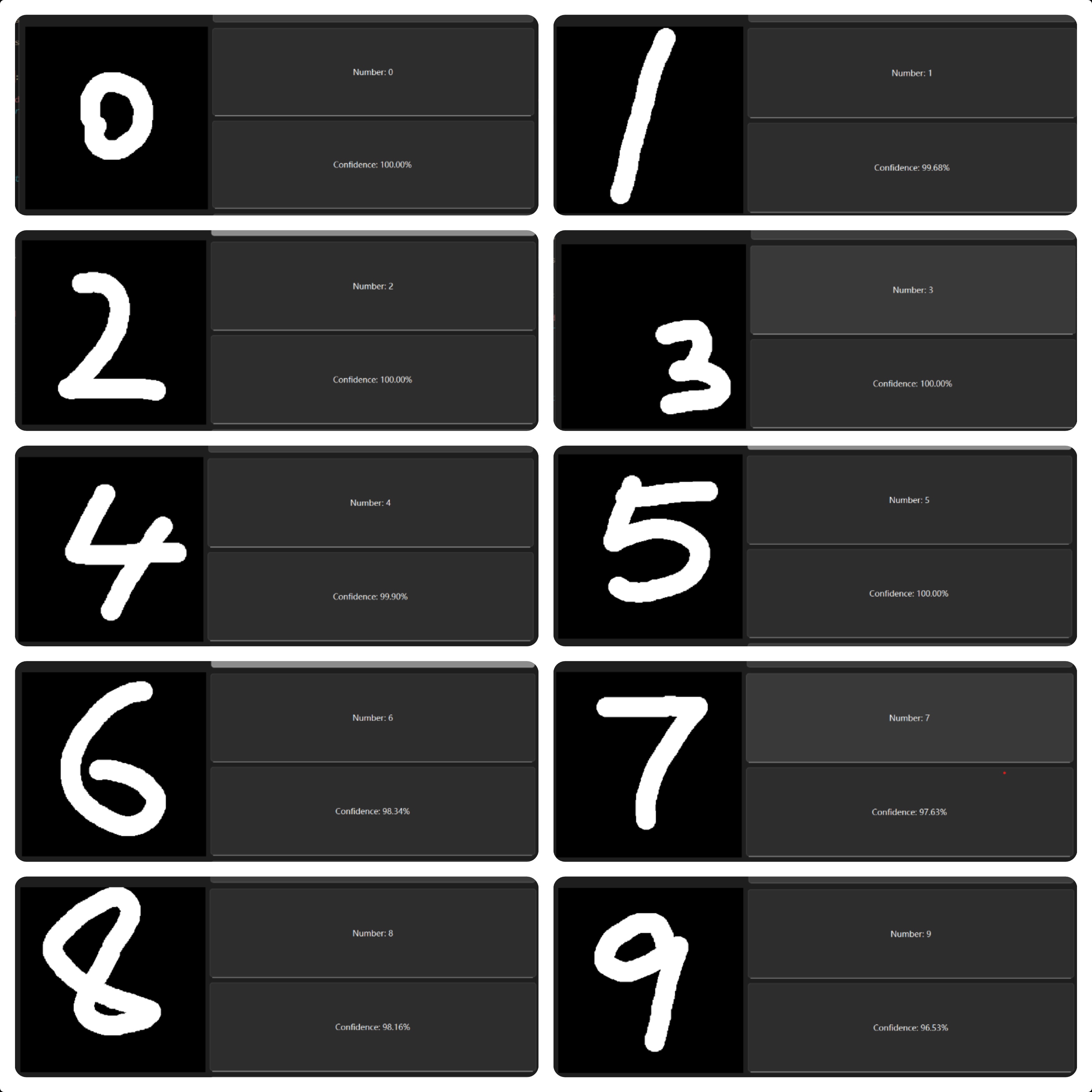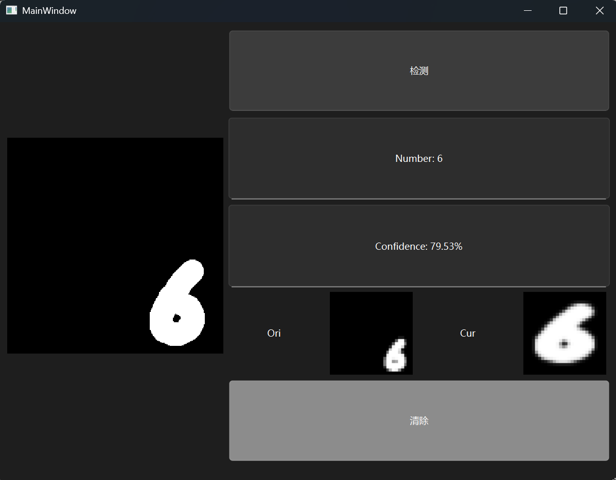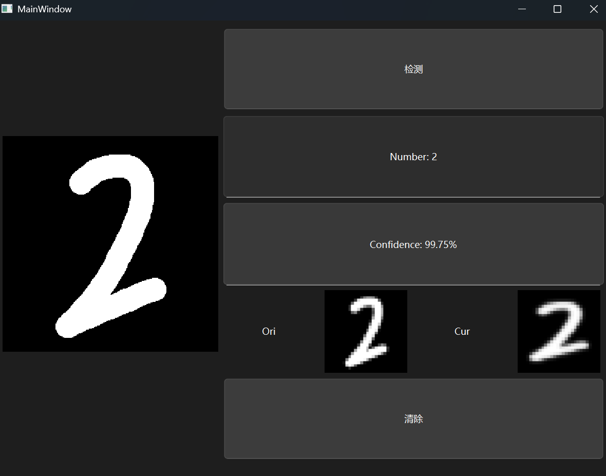 - 基本功能测试:包含手写板、检测与清除按钮、预测与置信度输出