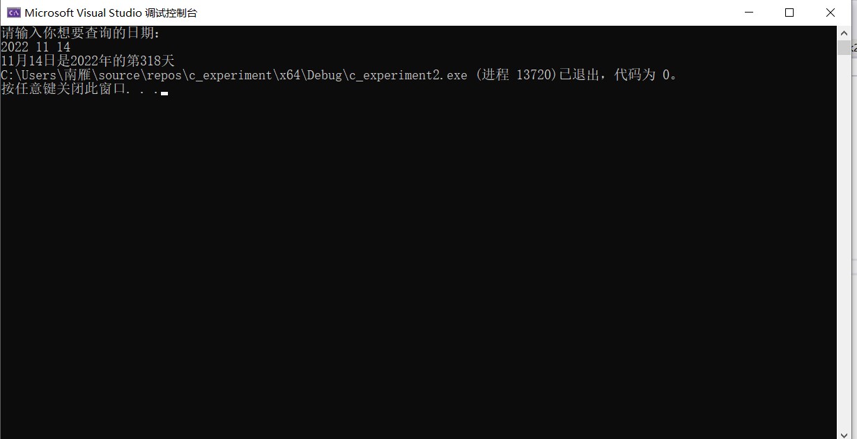 /* //编程实现从键盘上输入年月日,判断这个日期是这一年的第多少天。具体要求如下: //定义函数days_of_year,给出年月日,返回这个日期是这一年的第多少天 //在main函数中输入年月日,调用days_of_year。要求支持多组输入。 #include<stdio.h> int days_of_year(int year,int month,int day); int main() { int year, month, day,result; printf("请输入你想要查询的日期:\n"); while (scanf_s("%d%d%d", &year, &month, &day) != EOF) { result = days_of_year(year, month, day); printf("%d月%d日是%d年的第%d天\n", month, day, year, result); } return 0; } int days_of_year(int year,int month,int day) { int days[13]; int sum=0; if (((year % 4 == 0) && (year % 100 != 0)) || (year % 400 == 0)) { for (int i = 1; i <= 12; i++) { if (i == 1 || i == 3 || i == 5 || i == 7 || i == 8 || i == 10 || i == 12) days[i] = 31; else if (i == 2) days[i] = 29; else days[i] = 30; } } else { for (int j = 1; j <= 12; j++) { if (j == 1 || j == 3 || j == 5 || j == 7 || j == 8 || j == 10 || j == 12) days[j] = 31; else if (j == 2) days[j] = 28; else days[j] = 30; } } for (int k = 1; k < month; k++) sum = sum + days[k]; sum = sum + day; return sum; }*/