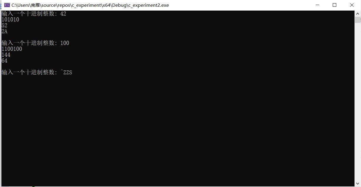 /* //编写一个函数dec2n(),实现把一个十进制数据x转换成n进制输出。(n取2,8,16)。在主函数中调用它,完成把一个十进制数转换成二进制、八进制、十六进制。 #include <stdio.h> #define N 100 void dec2n(int x, int n); // 函数声明 int main() { int x; printf("输入一个十进制整数: "); while (scanf_s("%d", &x) != EOF) { dec2n(x, 2); // 函数调用: 把x转换成二进制输出 dec2n(x, 8); // 函数调用: 把x转换成八进制输出 dec2n(x, 16); // 函数调用: 把x转换成十六进制输出 printf("\n输入一个十进制整数: "); } return 0; } // 函数定义 // 功能: 把十进制数x转换成n进制,打印输出 // 补足函数dec2n实现 void dec2n(int x, int n) { int c,i=0; int result[100]; while (1) { c = x % n; x = x / n; result[i] = c; if (x == 0) break; i++; } for (int j = i; j >= 0; j--) { if (result[j]>=10) { switch (result[j]) { case 10:printf("%c",'A'); break; case 11:printf("%c",'B'); break; case 12:printf("%c",'C'); break; case 13:printf("%c",'D'); break; case 14:printf("%c",'E'); break; case 15:printf("%c",'F'); break; } } else printf("%d", result[j]); } printf("\n"); } */