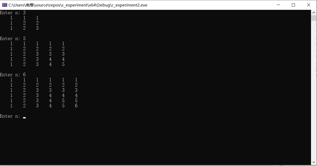 /* //编写函数func()实现生成n阶左上拐矩阵。如n=5,矩阵如下: //在主函数中输入n, 调用func()实现生成n阶左上拐矩阵,调用函数完成矩阵输出,要求支持多组输入 #include <stdio.h> #define N 100 // 函数声明 void func(int x[][N], int n); // 注意:两维数组作为形参的语法 void output(int x[][N], int n); // 注意:两维数组作为形参的语法 int main() { int x[N][N]; int i, j, n; printf("Enter n: "); while (scanf_s("%d", &n) != EOF) { func(x, n); // 注意:两维数组作为实参的语法 output(x, n); // 注意:两维数组作为实参的语法 printf("\nEnter n: "); } return 0; } // 函数定义 // 功能:输出两维数组x中的数据,数据项n行、n列 void output(int x[][N], int n) { int i, j; for (i = 0; i < n; ++i) { for (j = 0; j < n; ++j) printf("%5d", x[i][j]); printf("\n"); } } // 函数定义 // 功能:生成n行n列的左上拐矩阵,保存在两维数组x中 // 补足函数实现 void func(int x[][N], int n) { for (int i = 0; i < n; i++) { for (int j = i; j < n; j++) x[i][j] = i + 1; } for (int i = 0; i < n; i++) { for (int j = i; j < n; j++) x[j][i] = i + 1; } }*/