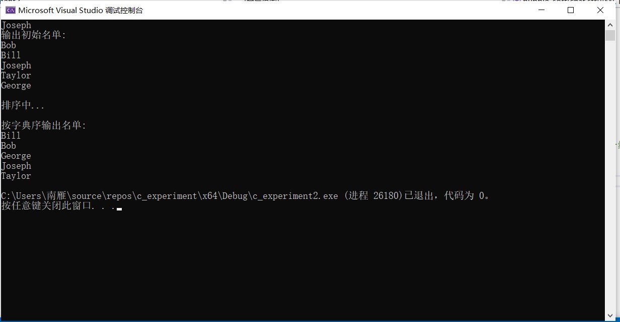 /* //编写函数bubble_sort()实现使用冒泡排序算法对一组字符串按字典序排序。 //在main()函数中,编写主体代码逻辑,完成英文名初始化、输出、排序及排序后输出 #include <stdio.h> #include <string.h> #define N 5 #define M 20 void bubble_sort(char str[][M], int n); // 函数声明 int main() { char name[][M] = { "Bob", "Bill", "Joseph", "Taylor", "George" }; int i; printf("%s\n", name[2]); printf("输出初始名单:\n"); for (i = 0; i < N; i++) printf("%s\n", name[i]); printf("\n排序中...\n"); bubble_sort(name, N); // 函数调用 printf("\n按字典序输出名单:\n"); for (i = 0; i < N; i++) printf("%s\n", name[i]); return 0; } // 函数定义 // 功能:使用冒泡排序算法对二维数组str中的n个字符串按字典序排序 // 补足函数bubble_sort()实现 void bubble_sort(char str[][M], int n) { char temp[M]; for(int i=0;i<n-1;i++) for(int j=0;j<n-1-i;j++) if (strcmp(str[j], str[j + 1])>0) //c语言只会把0当成false,一切非0当成true,所以若不加判断其是否大于0的话,每一组数据都将进入循环。 { strcpy_s(temp, M, str[j]); strcpy_s(str[j],M, str[j + 1]); strcpy_s(str[j + 1],M, temp); } } */