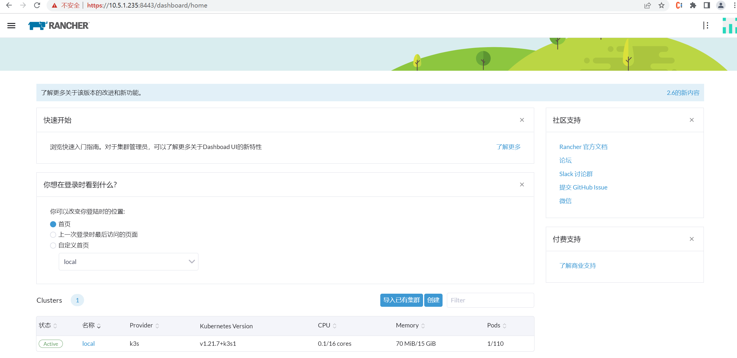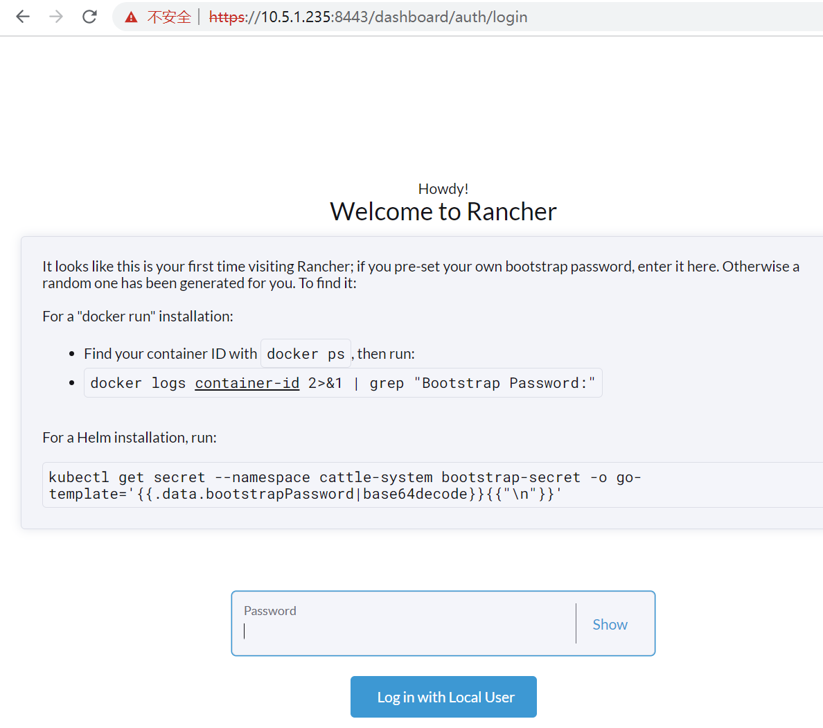 完成后,访问https://<部署主机的ip或全限定域名>:8443 ,进入rancher管理页面,我这边就是这个地址:https://10.5.1.235:8443/