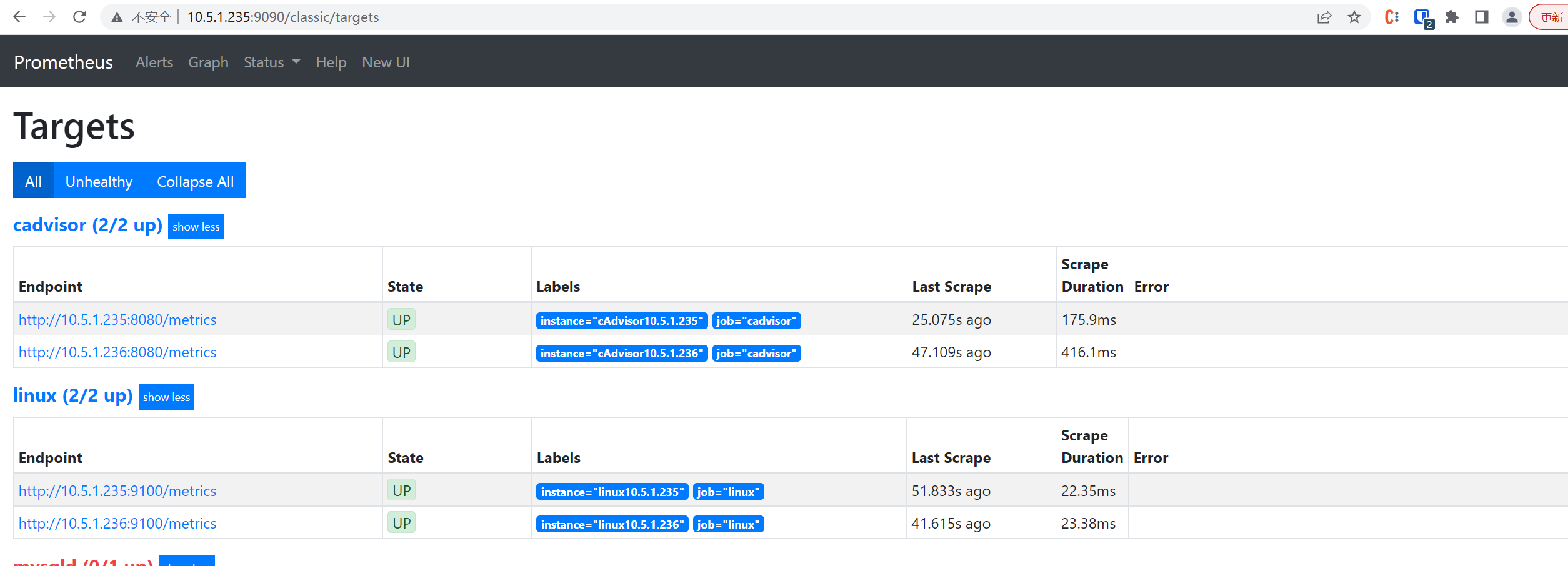 http://10.5.1.235:9090/targets:查看对应的监控节点