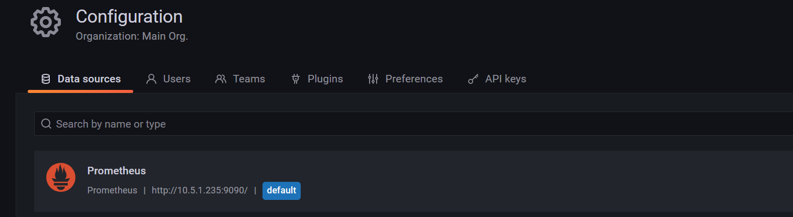 点击Setting——Add data source----选择Prometheus,输入IP和端口,我这边就是10.5.1.235:9090