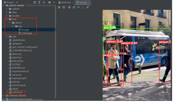 运行 detect.py,将会检测 data/images 中的图片,detect.py 运行结果保存到runs\detect\exp 中