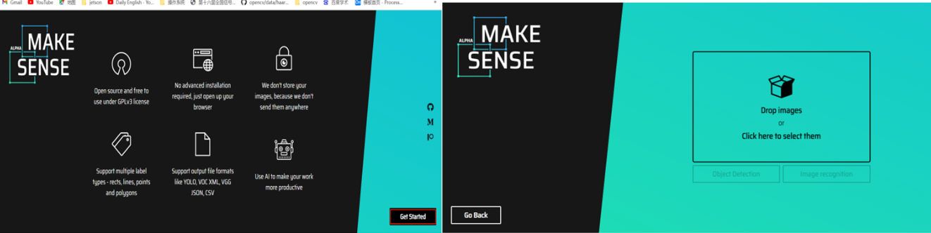 这是一个在线标注工具:https://www.makesense.ai/,点击 Get Started 进入右图,上传要训练的图片