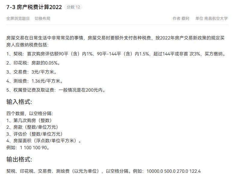 这里简单来说就是通过购房次数与房屋大小来判断应该缴纳多少税,理解了之后也觉得没什么难点,只是初次见到的时候要思考一下而已。最后输出所要求的四个值即可。