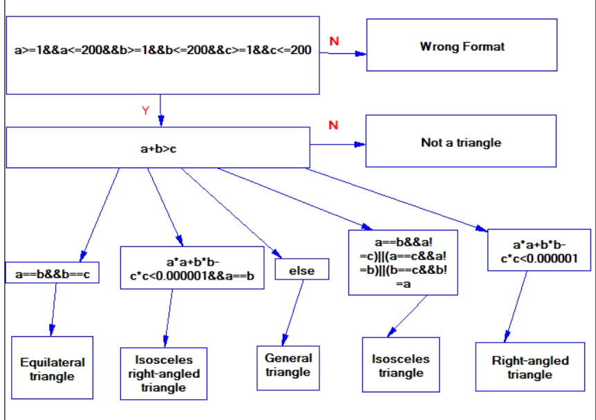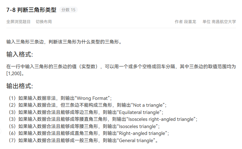 if(a>=1&&a<=200&&b>=1&&b<=200&&c>=1&&c<=200){//判断输入是否符合条件 if(a+b>c){//判断能否组成三角形 if(a==b&&b==c)//判断是不是等边三角形 System.out.println("Equilateral triangle"); else if(a*a+b*b-c*c<0.000001&&a==b)//判断是不是等腰直角三角形 System.out.println("Isosceles right-angled triangle"); else if((a==b&&a!=c)||(a==c&&a!=b)||(b==c&&b!=a))//判断是不是等腰三角形 System.out.println("Isosceles triangle"); else if(a*a+b*b-c*c<0.000001)//判断是不是直角三角形 System.out.println("Right-angled triangle"); else System.out.println("General triangle");//如果不是上述三角形那只能是普通三角形 } else System.out.println("Not a triangle"); } else System.out.println("Wrong Format");