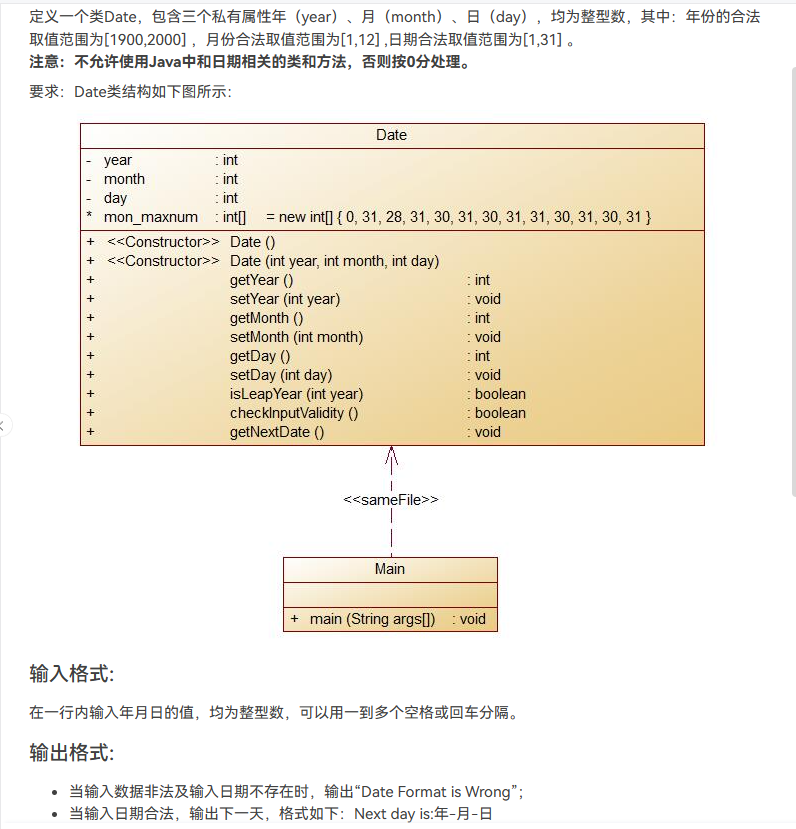 public void getNextDate(){ if(month==12&&day==31)//判断是不是今年最后一天 System.out.printf("Next day is:%d-%d-%d",++year,1,1);//年份加一,然后输出一月一日 else{ if(day==mon_maxnum[month]){//判断是不是本月最后一天 System.out.printf("Next day is:%d-%d-%d",year,++month,1);年份不动,月份加一,输出一日 } else{ System.out.printf("Next day is:%d-%d-%d",year,month,++day);//直接输出下一天 } } } }
