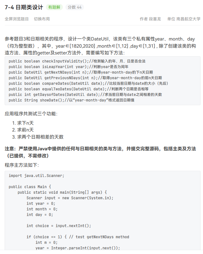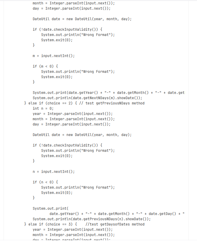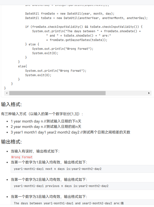 if (choice == 1) { // test getNextNDays method int m = 0;//定义要求接下来几天 year = Integer.parseInt(input.next());//得到年 month = Integer.parseInt(input.next());//得到月 day = Integer.parseInt(input.next());//得到日 DateUtil date = new DateUtil(year, month, day); if (!date.checkInputValidity()) {//如果判断为非法日期的话 System.out.println("Wrong Format");//输出 System.exit(0); } m = input.nextInt();//输入要求接下来几天 if (m < 0) {//m的范围 System.out.println("Wrong Format"); System.exit(0); } System.out.print(date.getYear() + "-" + date.getMonth() + "-" + date.getDay() + " next " + m + " days is:");//输出 System.out.println(date.getNextNDays(m).showDate()); } else if (choice == 2) { // test getPreviousNDays method int n = 0;//输入要求之前几天,接下来代码和上面基本相同,不再赘述。 year = Integer.parseInt(input.next()); month = Integer.parseInt(input.next()); day = Integer.parseInt(input.next()); DateUtil date = new DateUtil(year, month, day); if (!date.checkInputValidity()) { System.out.println("Wrong Format"); System.exit(0); } n = input.nextInt(); if (n < 0) { System.out.println("Wrong Format"); System.exit(0); } System.out.print( date.getYear() + "-" + date.getMonth() + "-" + date.getDay() + " previous " + n + " days is:"); System.out.println(date.getPreviousNDays(n).showDate()); } else if (choice == 3) { //test getDaysofDates method year = Integer.parseInt(input.next()); month = Integer.parseInt(input.next()); day = Integer.parseInt(input.next()); int anotherYear = Integer.parseInt(input.next());//输入要求的第二年的各项数据 int anotherMonth = Integer.parseInt(input.next()); int anotherDay = Integer.parseInt(input.next()); DateUtil fromDate = new DateUtil(year, month, day);//开始年份 DateUtil toDate = new DateUtil(anotherYear, anotherMonth, anotherDay);//结束年份 if (fromDate.checkInputValidity() && toDate.checkInputValidity()) {//判断两个年份的输入是否合法 System.out.println("The days between " + fromDate.showDate() + " and " + toDate.showDate() + " are:" + fromDate.getDaysofDates(toDate)); } else { System.out.println("Wrong Format"); System.exit(0); } } else{ System.out.println("Wrong Format"); System.exit(0); } } }
