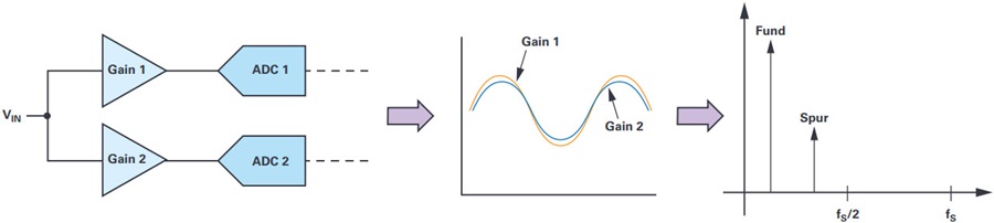 由于交错ADC之间存在不匹配,导致输出频谱中的杂散增大,如失调不匹配、增益不匹配、时序不匹配。