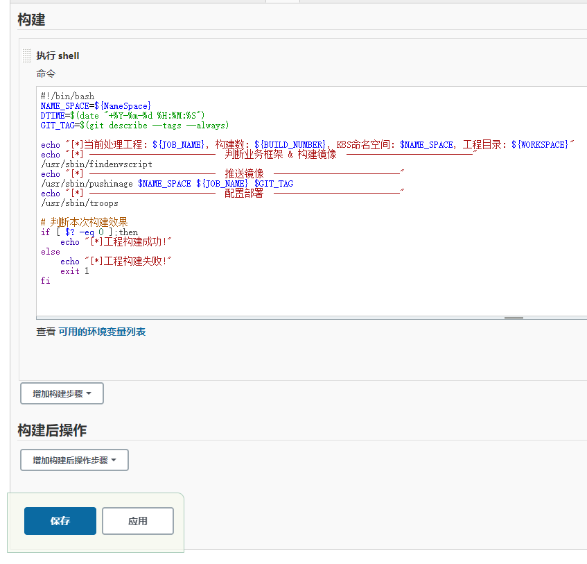 #!/bin/bash NAME_SPACE=${NameSpace} DTIME=$(date "+%Y-%m-%d %H:%M:%S") GIT_TAG=$(git describe --tags --always) echo "[*]当前处理工程: ${JOB_NAME}, 构建数: ${BUILD_NUMBER}, K8S命名空间: $NAME_SPACE, 工程目录: ${WORKSPACE}" echo "[*] -------------------------- 判断业务框架 & 构建镜像 --------------------------" /usr/sbin/findenvscript echo "[*] -------------------------- 推送镜像 --------------------------" /usr/sbin/pushimage $NAME_SPACE ${JOB_NAME} $GIT_TAG echo "[*] -------------------------- 配置部署 --------------------------" /usr/sbin/troops # 判断本次构建效果 if [ $? -eq 0 ];then echo "[*]工程构建成功!" else echo "[*]工程构建失败!" exit 1 fi