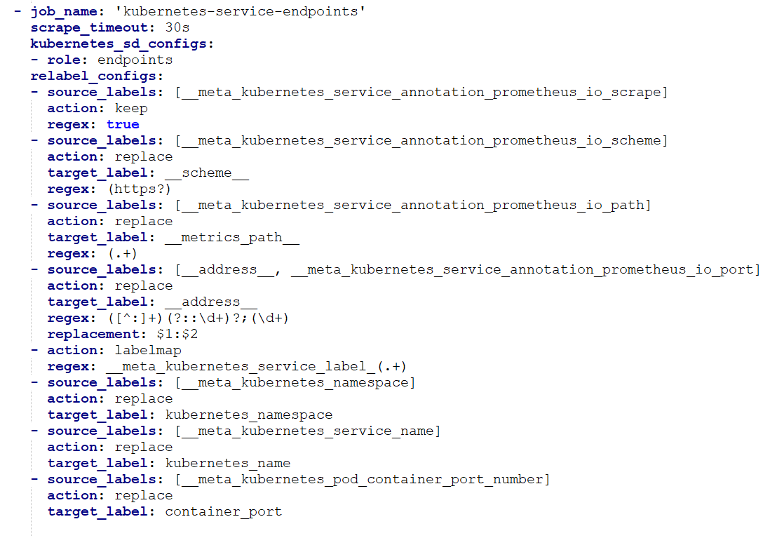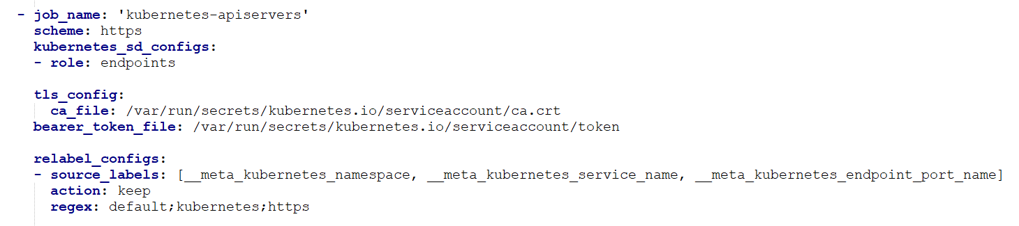 relabel_configs表示,对label进行二次过滤或命名。对source_labels的内容中匹配__meta_kubernetes_namespace=default,__meta_kubernetes_service_name=kubernetes,__meta_kubernetes_endpoint_port_name=https的,keep,即保留。其他值则全部丢弃。