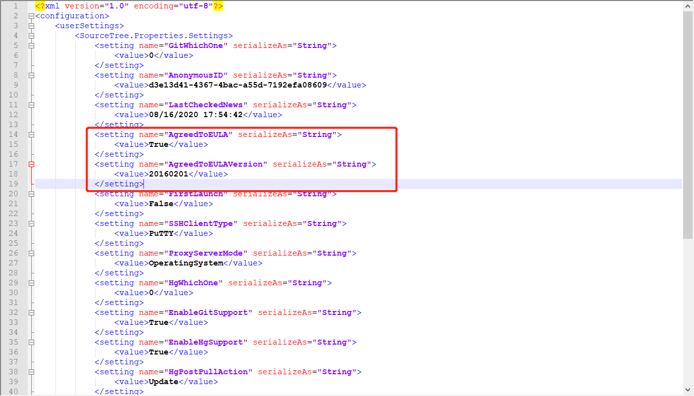 打开 %LocalAppData%\Atlassian,进入“SourceTree.exe_Url_iayhtc13zv3obzuz5vchezjs1az2q5ef”(注该目录可能和版本相关,不同版本的路径可能不完全一样。)接着进入"3.1.3.3158"目录,打开user.config文件,在里面加入六行代码。