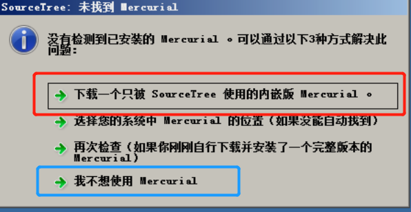 情况二:弹出Mercurial询问窗口,可以根据实际情况做相应的选择,比如使用默认选项下载Mercurial,或者使用第四个选项“我不想使用Mercurial”。直接用第一个选项即可!如图: