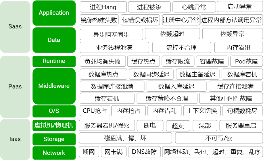 在真实业务场景中,遇到的任何故障都是混沌实验的潜在变量。目前业界已经有了按照 IaaS 层、PaaS 层、SaaS 层划分的故障画像 (如下图)。除了对这些已出现的问题进行分类、优先级排序外,也要对未来可能会出现的新问题保持关注。