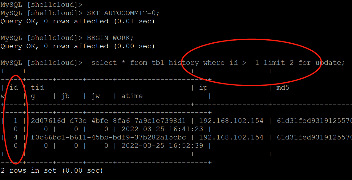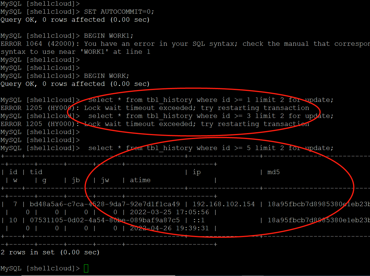 前两条会快速失败,只有第三条才成功,因为第三条的id已经大于4了。第一条语句只把id为1和4的两条数据加了行锁。这样就可以集群交替并发,而且保障事务等。