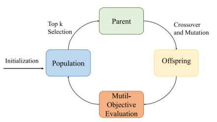 对子代进行多目标评估,以确定其适应度,为下一轮的选择做准备。这个循环不断重复,逐步找到更优的解。