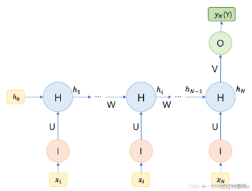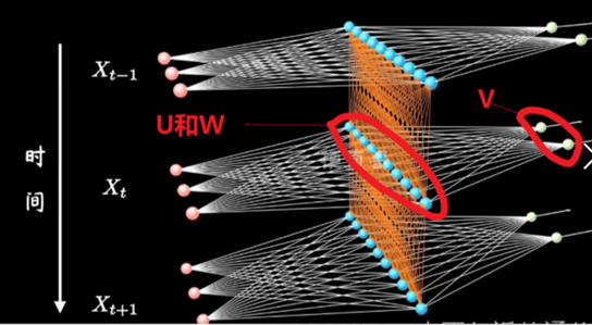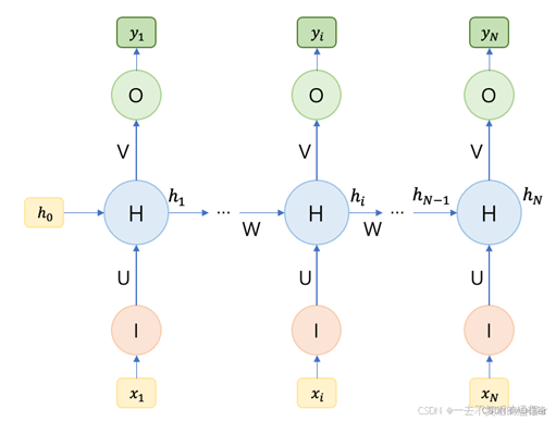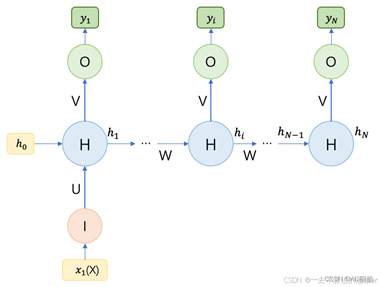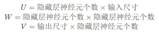 W是在不同的时间步 隐藏层之间递归的权重。在RNN中,不同时间步使用相同的W,为了保证信息能够传递下去。U和W都在隐藏层神经元上,V在输出层神经元上。参数的尺寸如下: