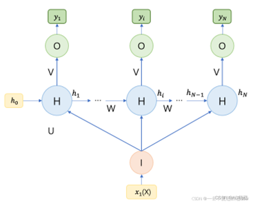 1 to N 结构RNN,表示一个输入数据对应输出一个序列的模型,输入位置有两种形式,适用于图生文任务: