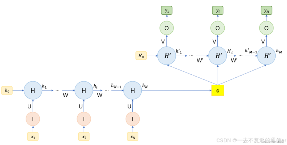 主要实现原理为在encoder和decoder之间,增加了一个上下文向量c,向量c中包含着输入系列的语义信息和序列化信息。在上图中,c作为decoder的输入数据。此外,c还可以作为decoder的隐层初始变量,如下所示第二种: