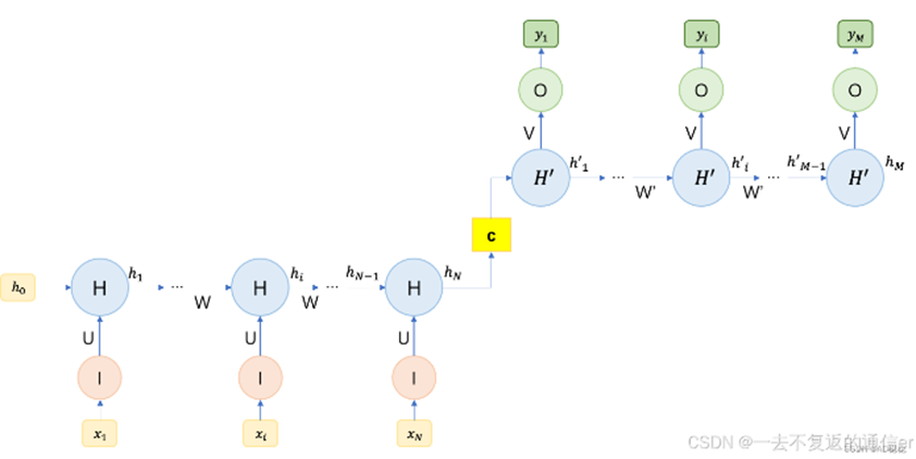 N to M:输入及输出序列不等长的结构,将两个不等长的RNN进行组合。输入与输出序列不等长的结构。N和M分别为输入序列长度及输出序列长度,该结构我们采用一个N to 1结构作为encoder,一个1 to M结构作为decoder来实现。一个编码器一个解码器。