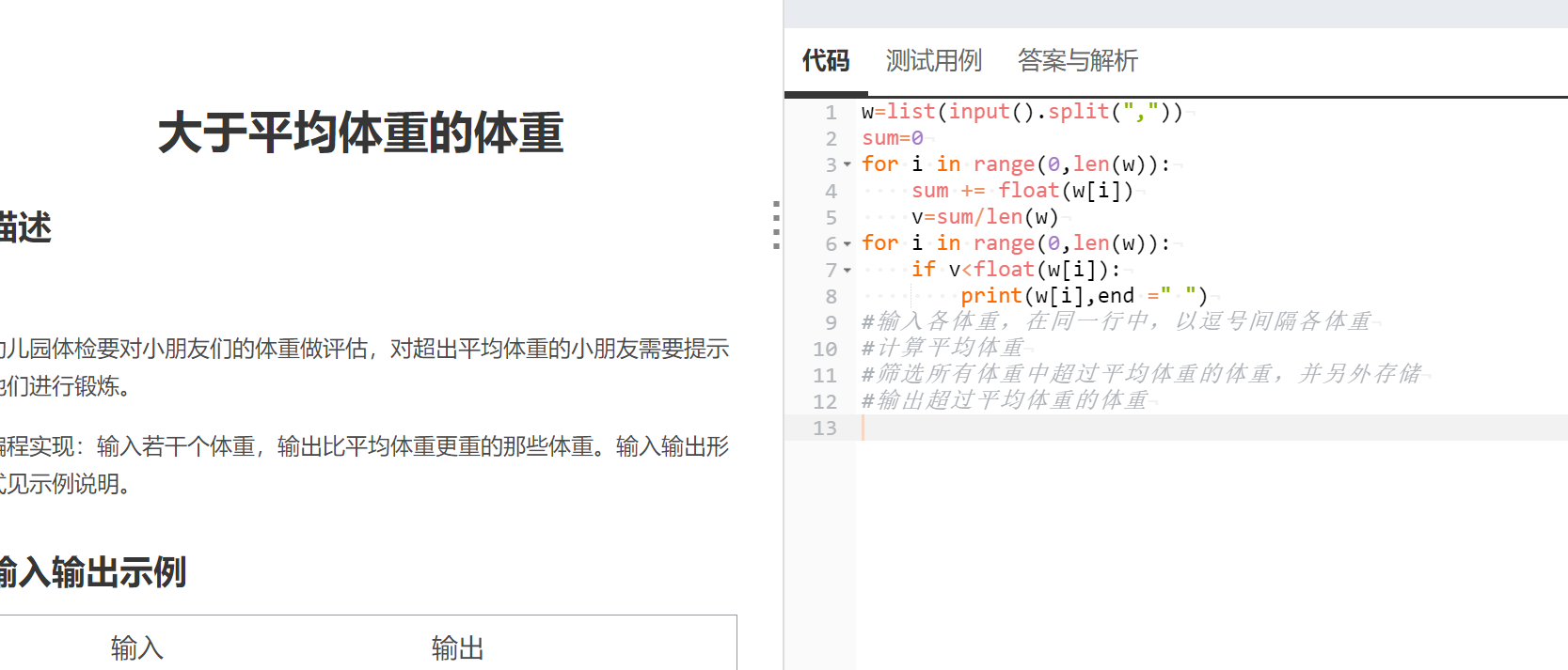 编程实现:输入若干个体重,输出比平均体重更重的那些体重。输入输出形式见示例说明。