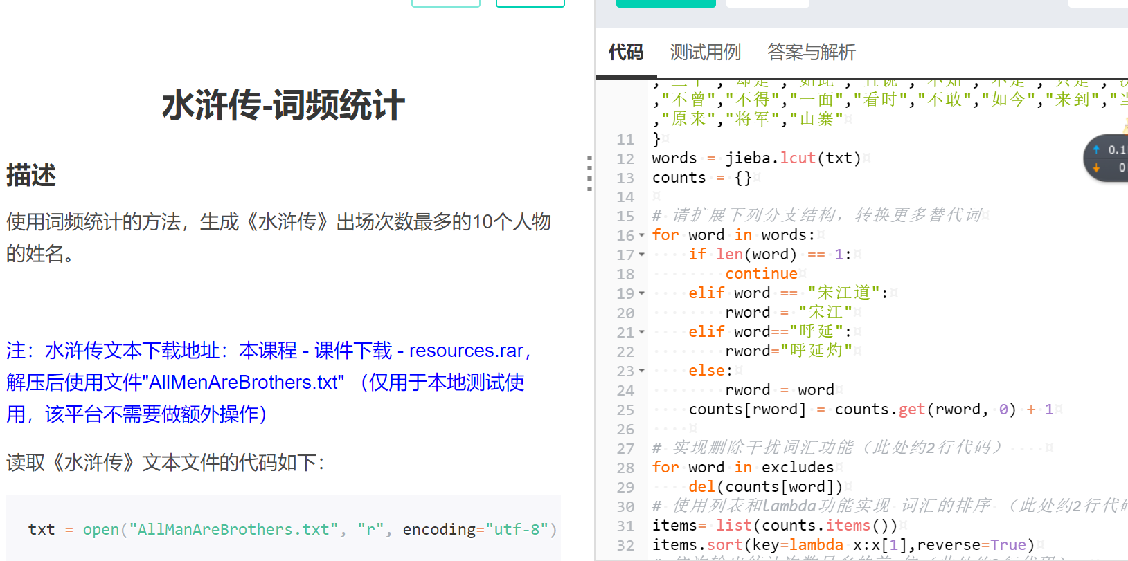使用词频统计的方法,生成《水浒传》出场次数最多的10个人物的姓名。
