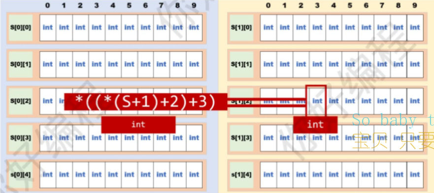 *(*(S+1)+2)+3=int(*)[3]//指针先被*变为数组int[10],然后出现在表达式变为指针移动3个步长,最后成为指向S[2][2][3]的指针