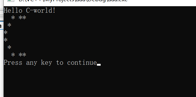 #include<stdio.h> main() { printf("Hello C-world!\n"); printf(" * **\n"); printf(" *\n"); printf("*\n"); printf("*\n"); printf(" *\n"); printf(" * **\n"); }