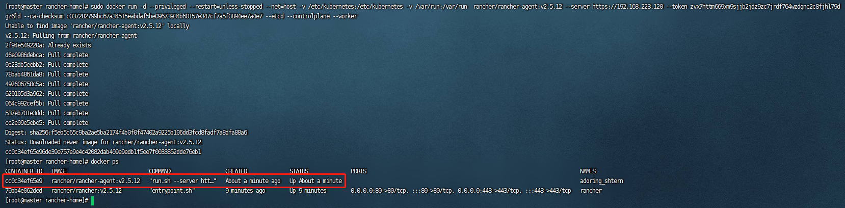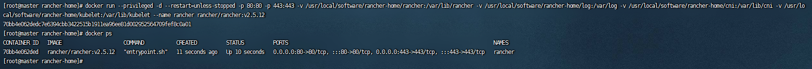 docker run --privileged -d --restart=unless-stopped -p 80:80 -p 443:443 -v /usr/local/software/rancher-home/rancher:/var/lib/rancher -v /usr/local/software/rancher-home/log:/var/log -v /usr/local/software/rancher-home/cni:/var/lib/cni -v /usr/local/software/rancher-home/kubelet:/var/lib/kubelet --name rancher rancher/rancher:v2.5.12