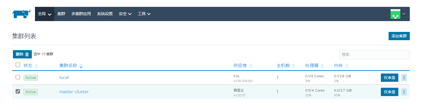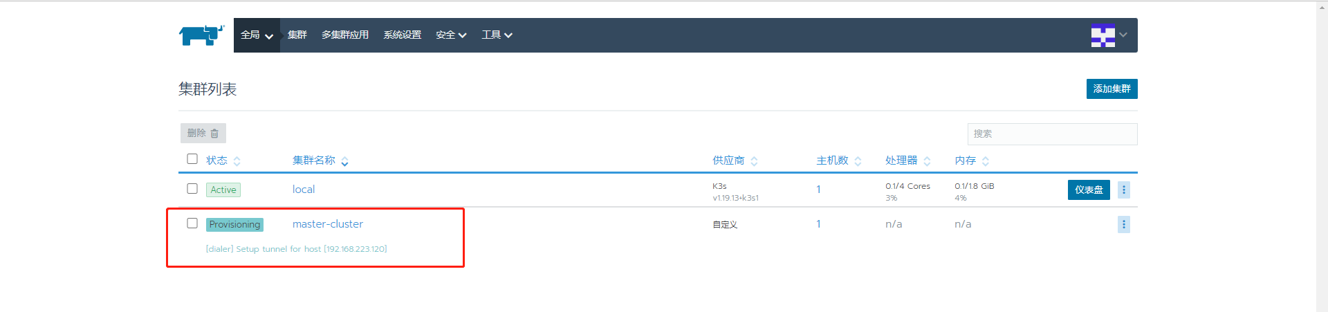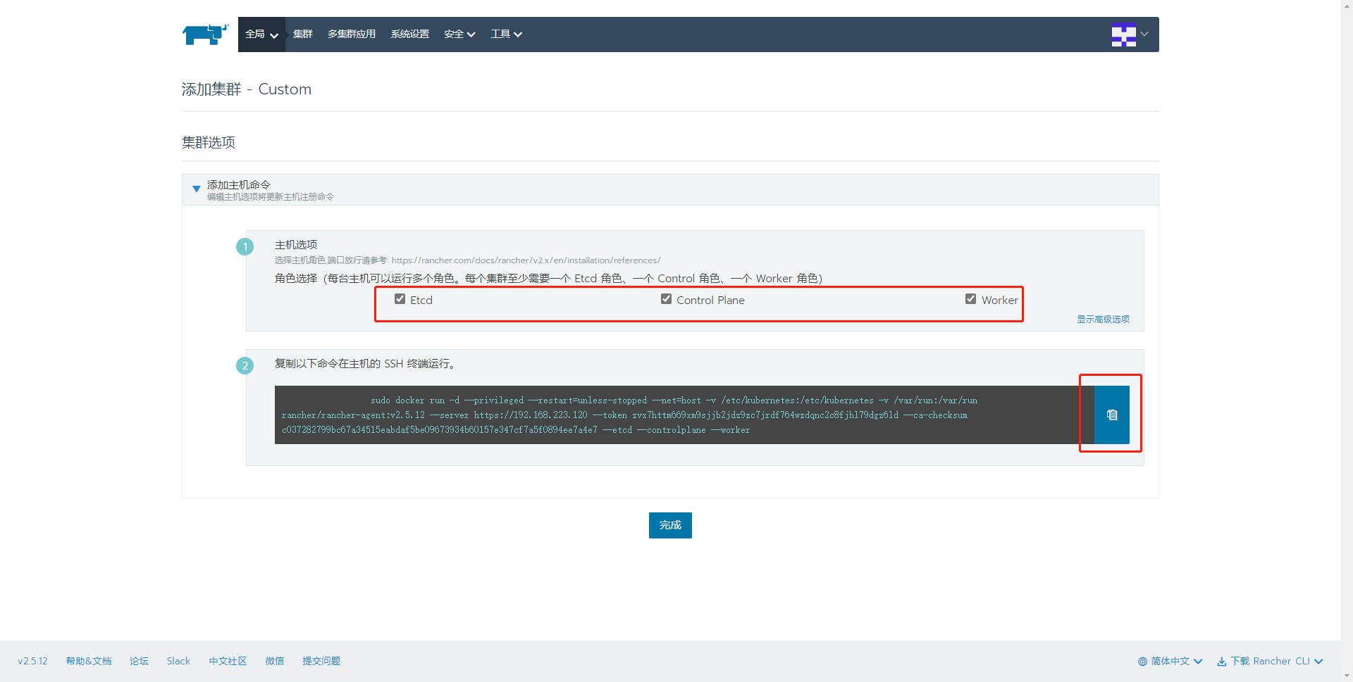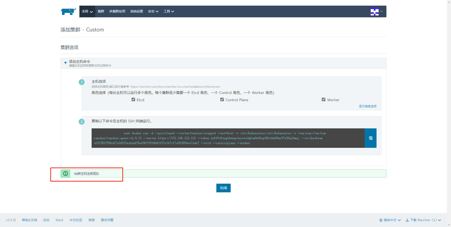 添加集群 -> 自定义 -> 录入基本配置信息后下一步 -> 勾选Etcd和Control Plane -> 复制需要在主机SSH运行的命令 -> 执行命令 -> 界面提示主机注册成功后点击完成 -> 等待集群状态变成 Active【需要点时间】