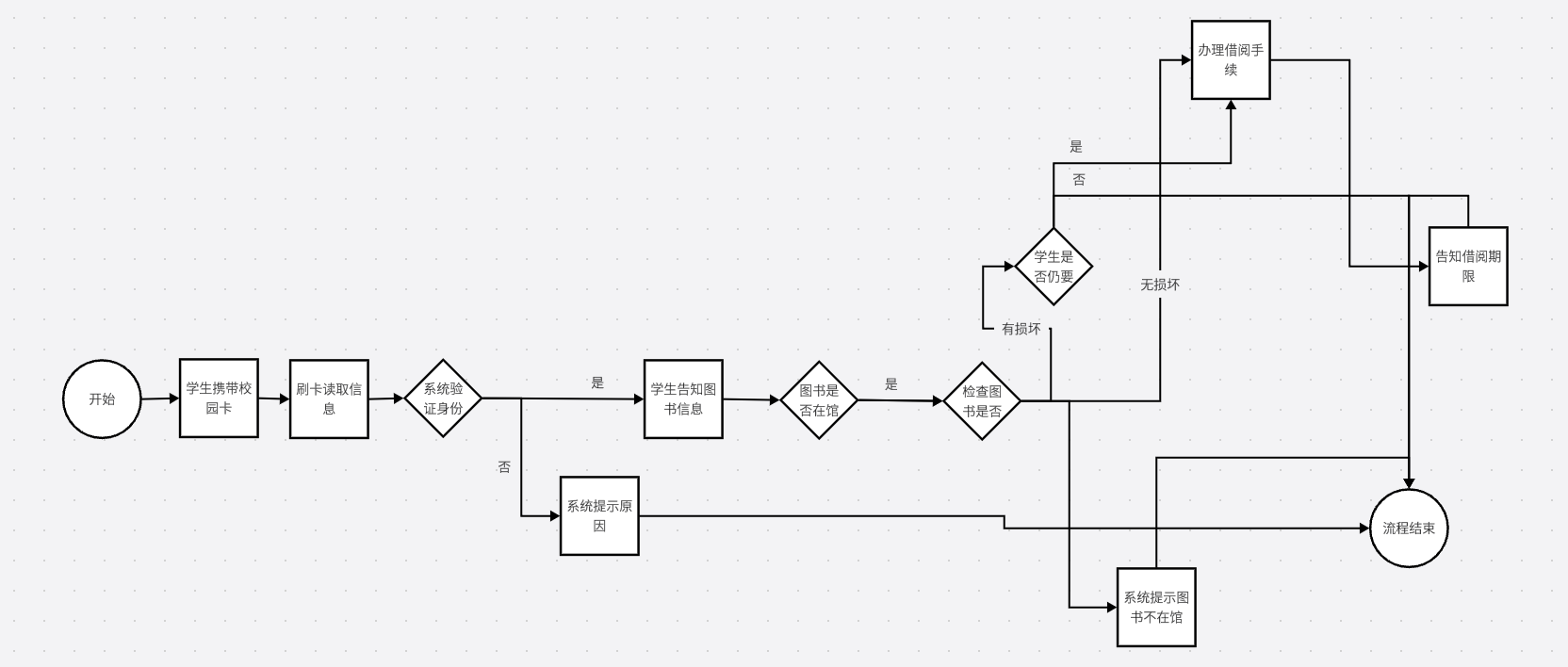 背景说明:在学校图书馆借阅管理系统中,学生借阅图书需要经过一系列流程。首先,学生携带校园卡前往借阅处,工作人员通过刷卡设备读取学生信息,系统验证学生身份是否有效。若身份无效,系统提示原因(如校园卡过期、欠费等)。若身份有效,学生告知工作人员想要借阅的图书名称或编号,工作人员在系统中查询该图书是否在馆。若图书不在馆,系统提示学生。若图书在馆,工作人员检查图书是否有损坏情况。若图书有损坏,记录损坏信息并询问学生是否仍要借阅。若学生选择不借阅,流程结束;若学生仍要借阅,工作人员办理借阅手续,将借阅信息录入系统,更新图书状态为已借出,并告知学生借阅期限和归还日期,最后流程结束。