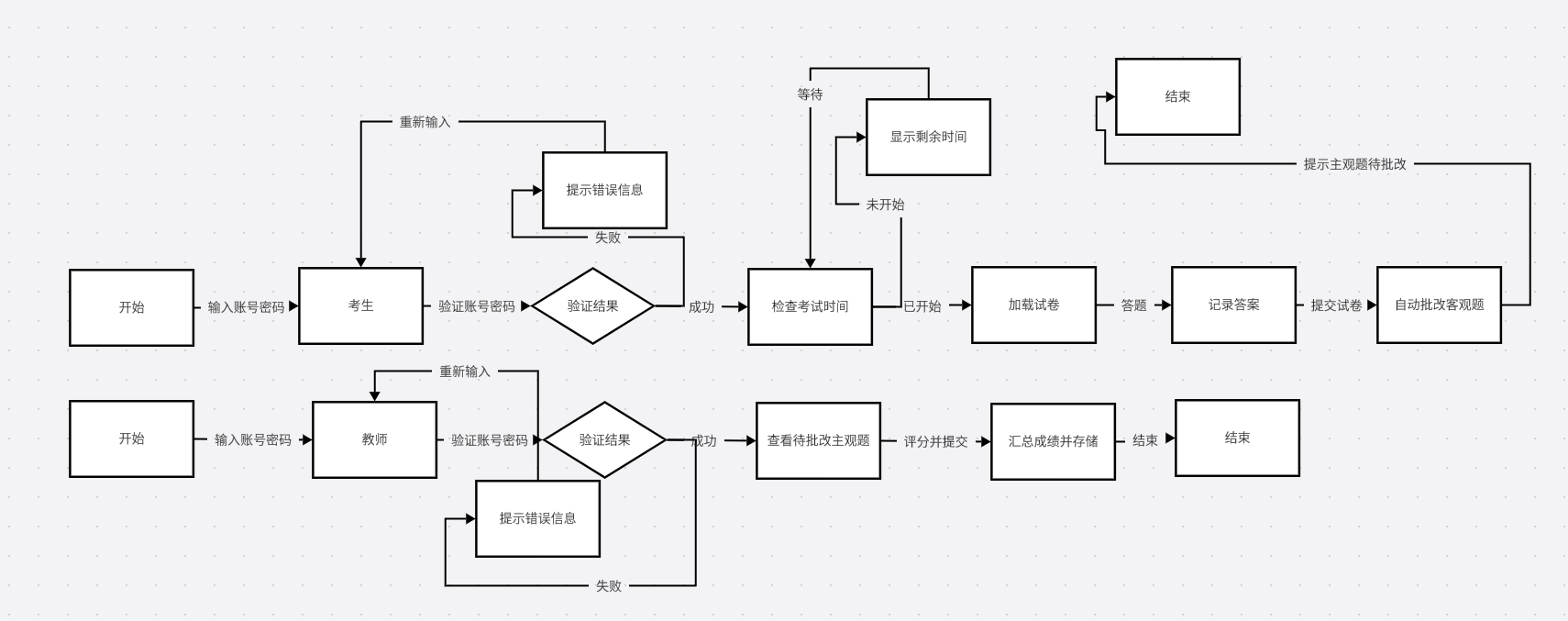 背景说明:某在线考试系统的使用流程如下。考生在考试开始前,打开考试客户端,输入自己的账号和密码进行登录。系统验证账号密码的正确性,若验证失败,提示考生错误信息(如账号不存在、密码错误),考生可重新输入。若验证成功,系统检查考试是否开始。若考试未开始,显示距离考试开始的剩余时间,考生等待;若考试已开始,系统加载试卷内容供考生答题。考生答题过程中,系统实时记录答案。答题结束后,考生提交试卷,系统自动批改客观题答案,对于主观题,提示等待教师批改。教师登录系统后,查看待批改的主观题,进行评分并提交,系统汇总所有题目得分,生成考生最终成绩并存储,最后流程结束。