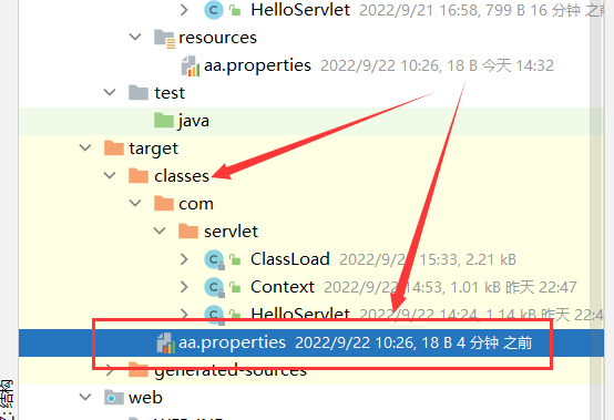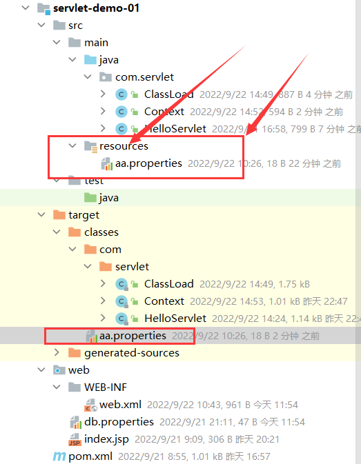例二:在【servlet-demo-01】的servlet包中创建一个Context的Java文件,并在【resources】创建一个aa的配置文件aa.properties,而这个配置文件内容如下图所示:
