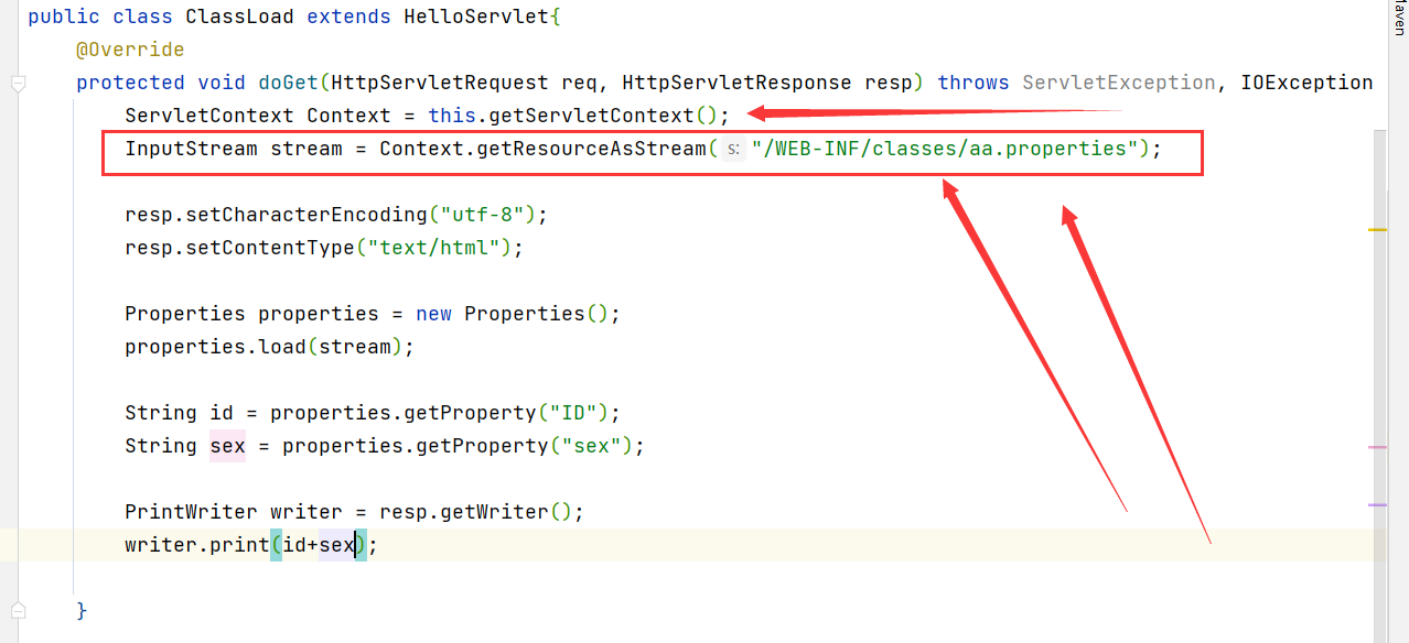 如果没有【classes】目录,服务器会自动帮我们创建,因此,只要是放置在【src】目录中的资源,最后也会被服务器自动放置在【classes】目录中,这样我们可以继续通过ServletContext对象来获取: