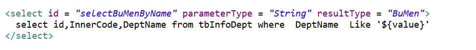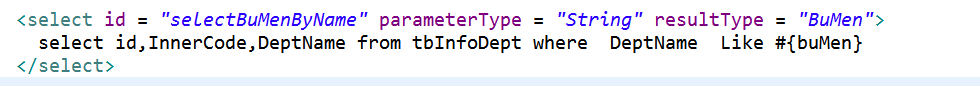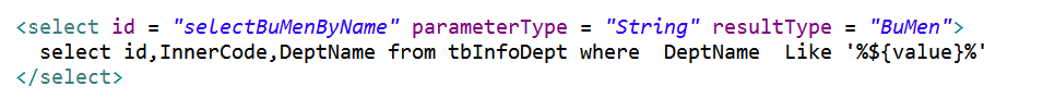 生成的查询语句为:select id,InnerCode,DeptName from tbInfoDept where DeptName like '%部%'