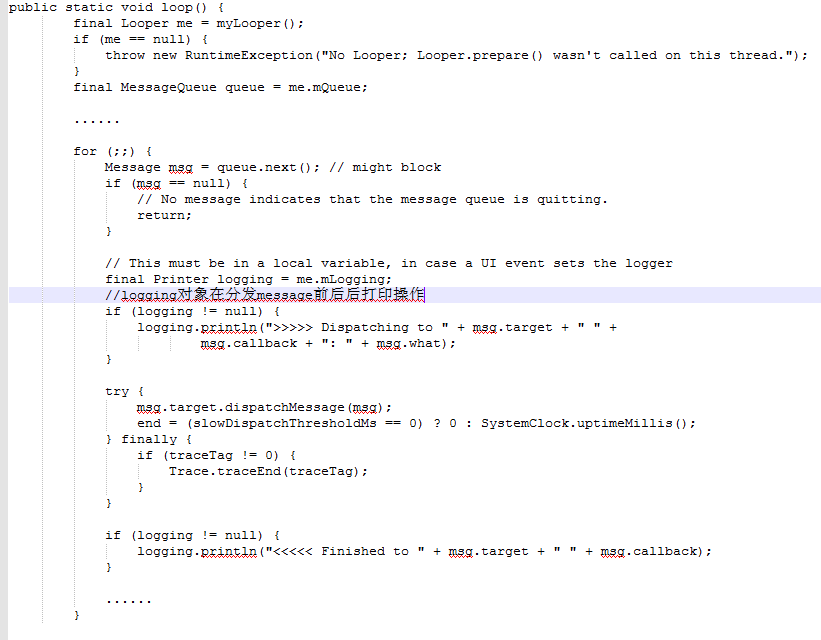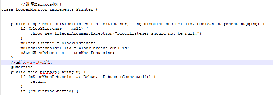 这个log打印逻辑正是在Message消息分发前后,大部分的性能卡顿问题都是在这里发生的,监控这两个逻辑之间的时间差就可以得到当前主线程的卡顿状态,如果超时则获取trace信息并上报。具体实现: