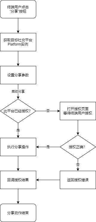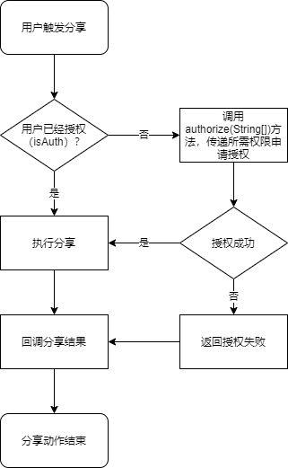 执行分享前先通过isAuth方法判断终端用户是否已经授权了分享,如未授权,则自行调用authorize的另一种重载方法authorize(String[])来直接指定需要的权限列表进行授权,并在授权成功后调用share方法继续分享。